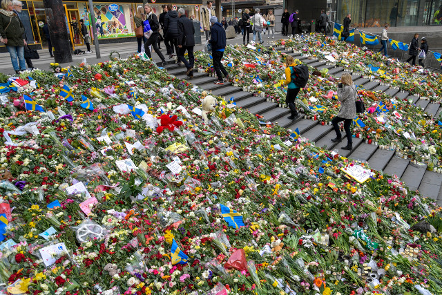 STOCKHOLM 2017-04-10 Trappan vid Sergels Torg mot Drottninggatan täckt av blommor på måndagsmorgonen. Foto: Anders Wiklund / TT / Kod 10040
