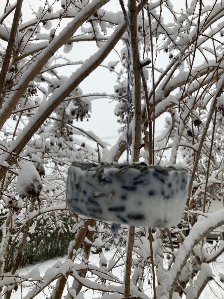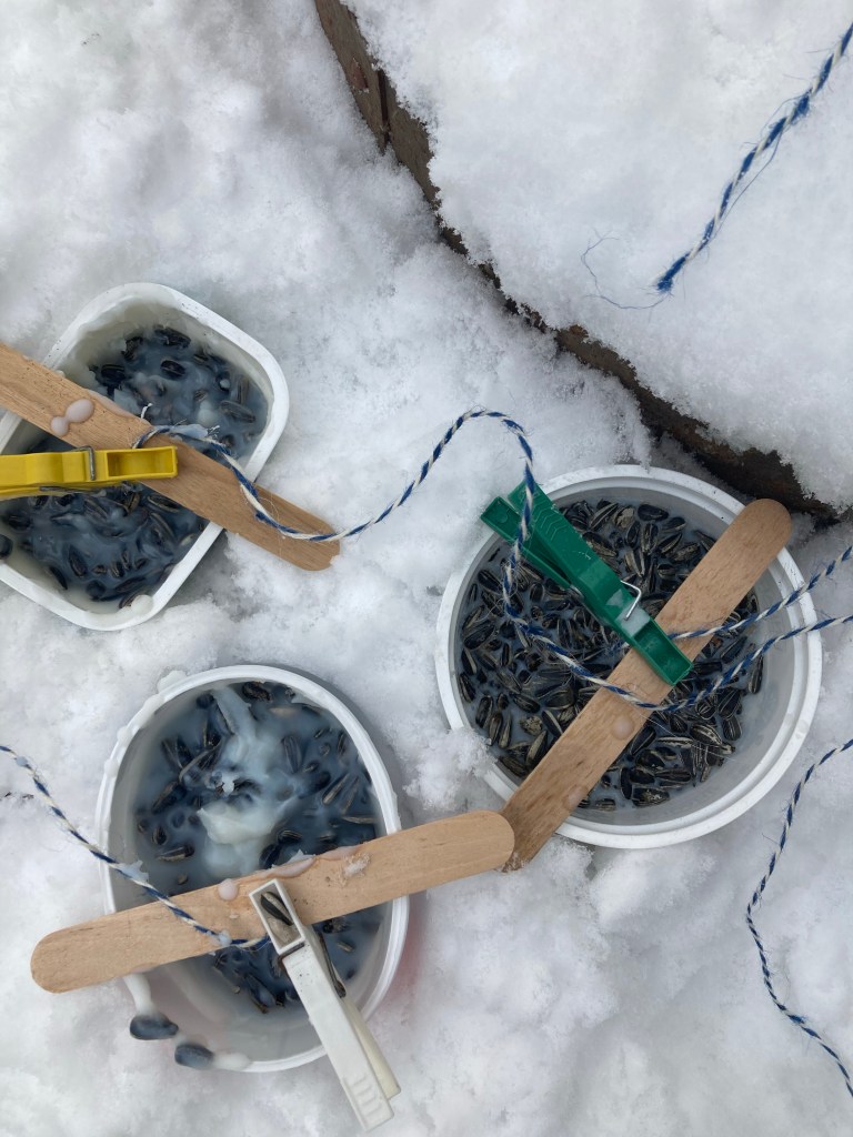 No sooner was there fresh snow on the ground, when we replaced the batteries in Elsa’s Birdsong book and got ourselves outside listening to the birds. To attract the birds into our garden, we made the Fat Ball Bird Feeder with some string, an old yoghurt pot, a scoop of lard and bird feed. My engineering skills were topnotch, although a sudden burst of spring melted one of them.